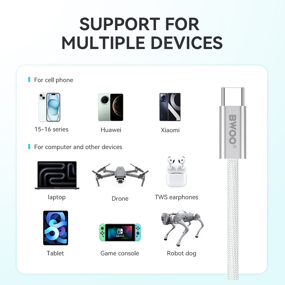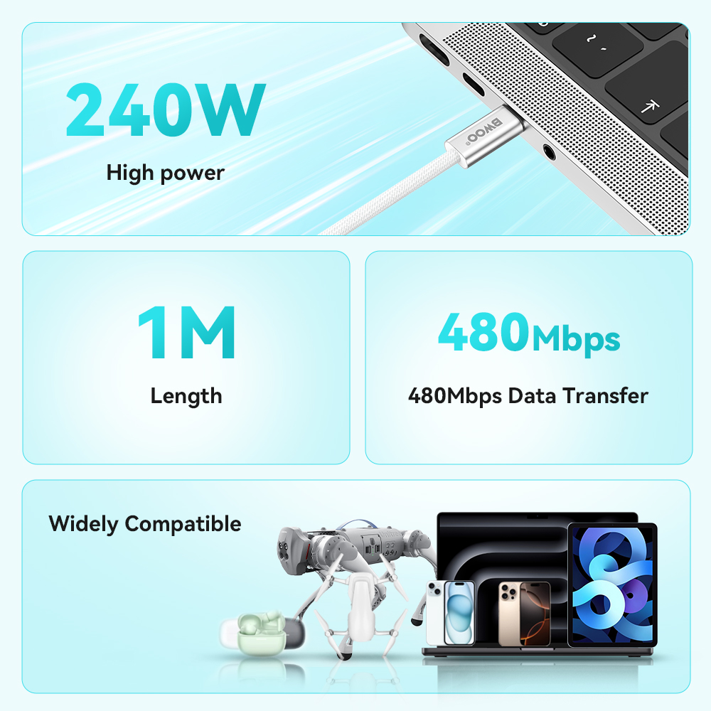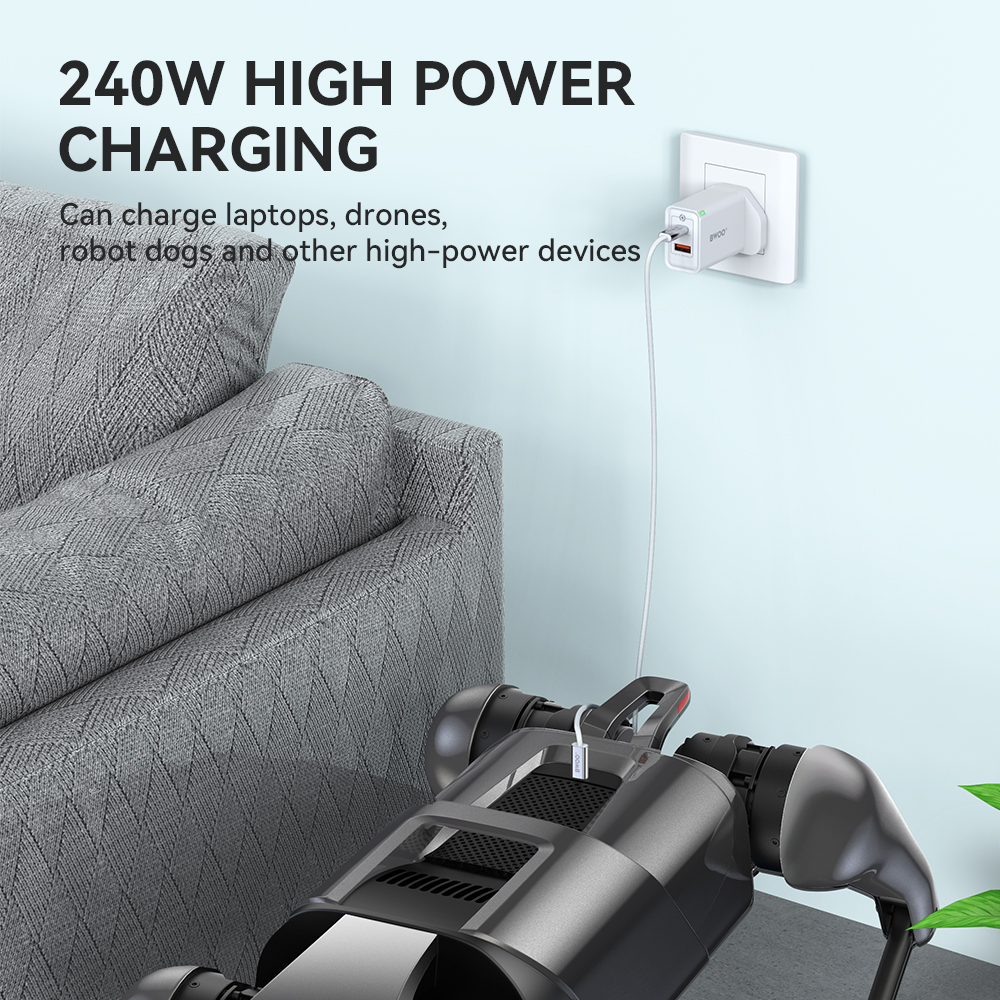 Το καλώδιο γρήγορης φόρτισης USB-C σε USB-C 240W παρέχει εξαιρετικά γρήγορη φόρτιση για συσκευές που καταναλώνουν πολύ ενέργεια, όπως φορητούς υπολογιστές, drones ή ρομποτικά συστήματα – προσφέροντας έως και 240W ισχύος για πλήρη φόρτιση σε ελάχιστο χρόνο.