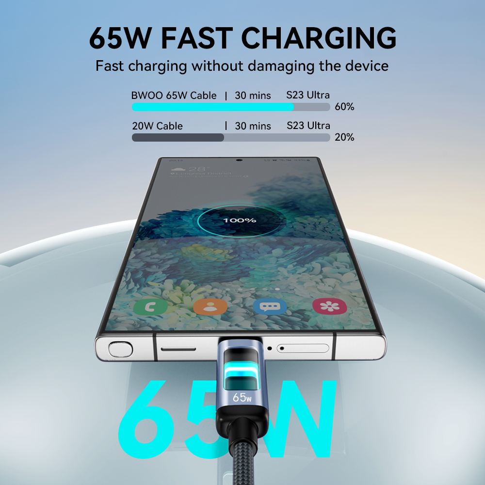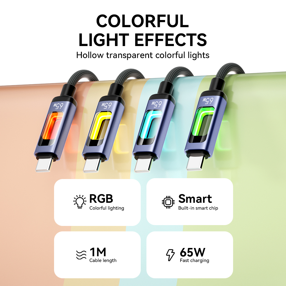 Τροφοδοτήστε φορητούς υπολογιστές, tablet και smartphone με μέγιστη ισχύ 65W — γρήγορα και με ασφάλεια. Το καλώδιο USB-C σε USB-C έχει σχεδιαστεί για ασφαλή φόρτιση υψηλής απόδοσης χωρίς τον κίνδυνο πρόκλησης ζημιάς στις συσκευές. Το μήκος του 1 μέτρου παρέχει ευκολία χρήσης στο σπίτι, στο γραφείο και κατά τη διάρκεια ταξιδιού. Κατά τη φόρτιση, το καλώδιο ανάβει με πολύχρωμα φώτα RGB, κάτι που φαίνεται εντυπωσιακό και τραβάει την προσοχή. Αυτός ο συνδυασμός υψηλής λειτουργικότητας και μοντέρνου στυλ ξεχωρίζει ανάμεσα σε άλλα αξεσουάρ.