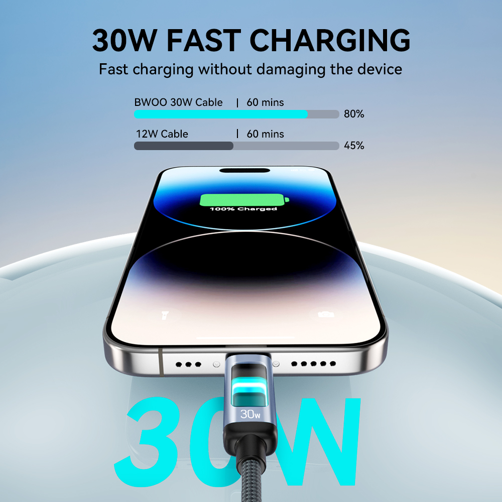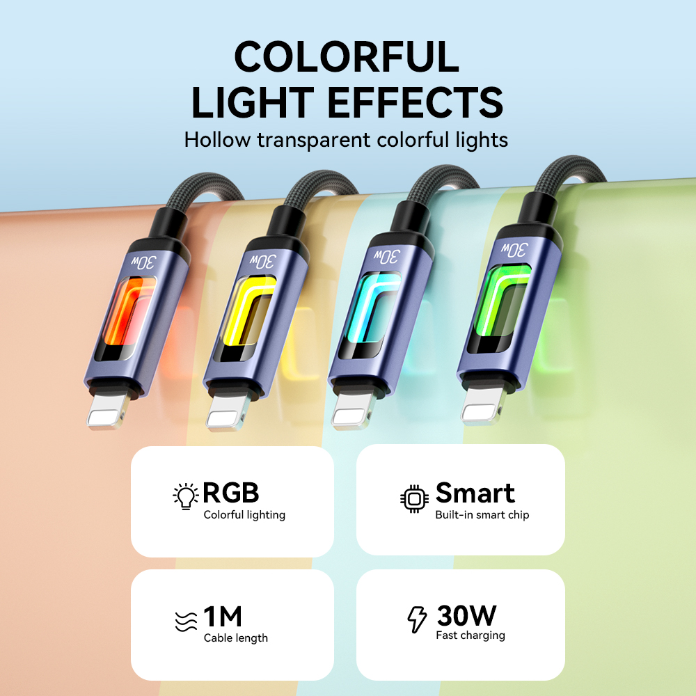 Αστραπιαία φόρτιση 27W για όλες τις συσκευές με υποδοχή Lightning. Η υποδοχή USB-C σε Lightning εγγυάται μέγιστη ισχύ χωρίς τον κίνδυνο πρόκλησης ζημιάς στη συσκευή. Κατά τη φόρτιση, το καλώδιο ανάβει με πολύχρωμο φωτισμό RGB που τραβάει την προσοχή. Προσφέρει όχι μόνο λειτουργικότητα αλλά και μοντέρνο σχεδιασμό που ξεχωρίζει.