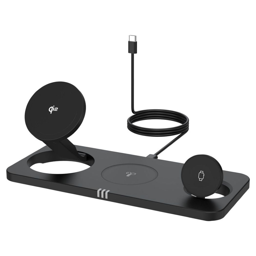 Φόρτιση τριών συσκευών ταυτόχρονα Χάρη στη συμβατότητα με MagSafe® , ο φορτιστής επιτρέπει την ταυτόχρονη φόρτιση ενός iPhone®, Apple Watch® και AirPods® ή συσκευών άλλων εμπορικών σημάτων. Αυτή η πρακτική λύση βοηθά στην οργάνωση του χώρου εργασίας σας και εξοικονομεί χρόνο, καθιστώντας τον ιδανικό τόσο για οικιακή όσο και για επαγγελματική χρήση. Είναι σημαντικό ότι πολλοί φορτιστές μειώνουν την ισχύ φόρτισης για άλλες συσκευές κατά τη φόρτιση ενός iPhone®. Ο φορτιστής MagNetix παρέχει πλήρη ισχύ εξόδου 20,5 W και για τις τρεις συσκευές ταυτόχρονα.