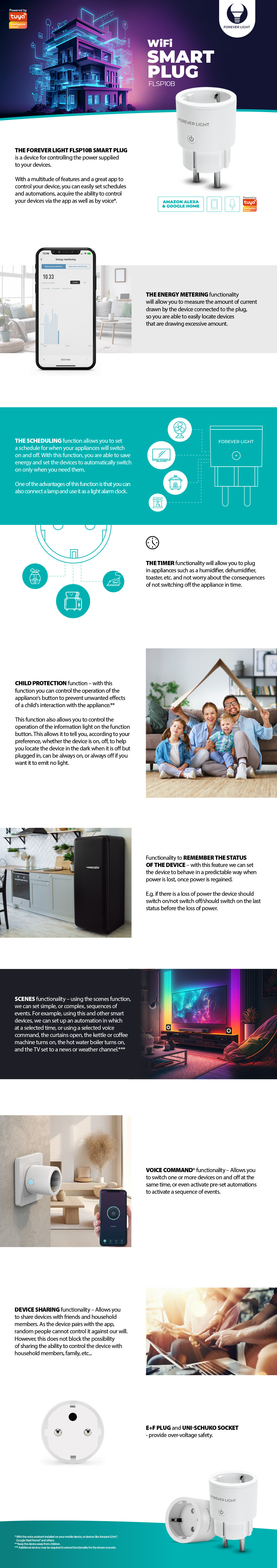Η έξυπνη πρίζα WiFi Forever Light FLSP10B επιτρέπει την απομακρυσμένη διαχείριση της ηλεκτρικής ενέργειας των συνδεδεμένων συσκευών με διάφορους τρόπους: χειροκίνητα, μέσω προγραμματισμού ή φωνητικά (Amazon Alexa, Google Home).