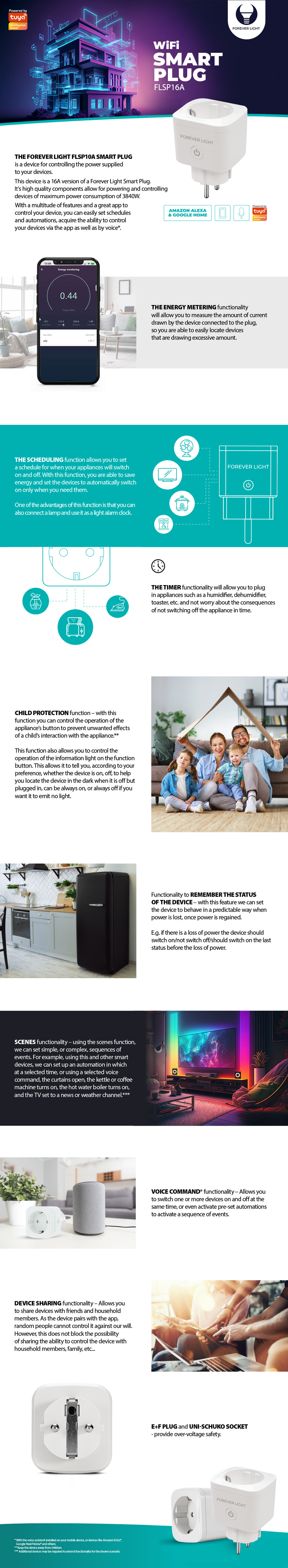 Η έξυπνη πρίζα WiFi Forever Light FLSP16A επιτρέπει την απομακρυσμένη διαχείριση της ηλεκτρικής ενέργειας των συνδεδεμένων συσκευών με διάφορους τρόπους: χειροκίνητα, μέσω προγραμματισμού ή φωνητικά (Amazon Alexa, Google Home).