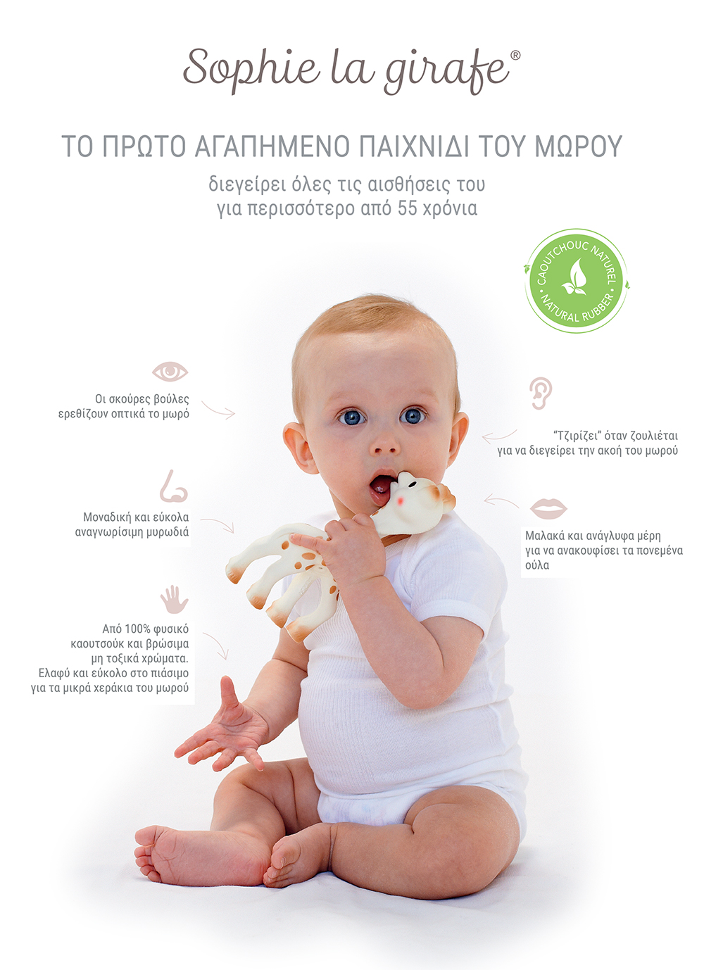 Κατάλληλη για νεογέννητα. Το μεγάλο της μέγεθος θα κάνει το μωράκι σας ακόμη πιο χαρούμενο! Η διάσημη Σόφι η καμηλοπάρδαλη, από φυσικό καουτσούκ (χωρίς φθαλικά), υπάρχει στις ζωές των μωρών σχεδόν 50 χρόνια!