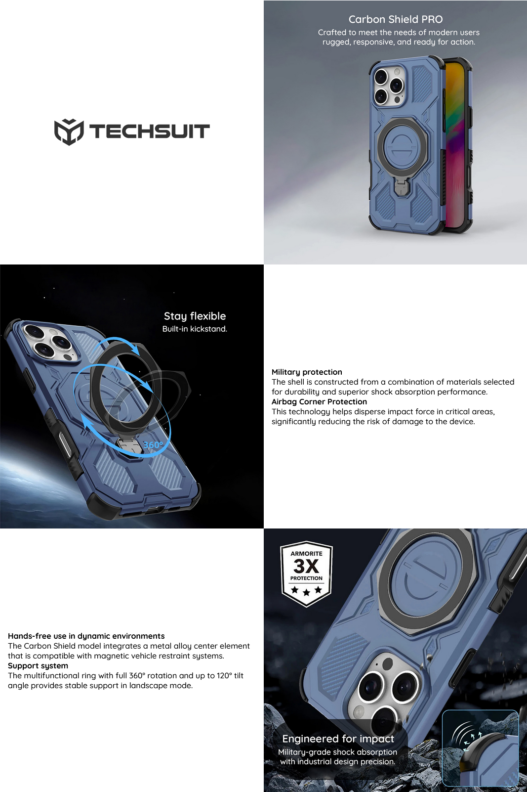 Θήκη Techsuit Carbon Shield PRO - θωρακισμένη προστασία με λαβή 360°. Η θήκη Carbon Shield PRO είναι μια εξαιρετικά ανθεκτική προστασία smartphone, κατασκευασμένη από συνδυασμό TPU και PC, παρέχοντας μέγιστη αντοχή σε πτώσεις, κραδασμούς και γρατσουνιές. Διαθέτει μεταλλικό δακτύλιο που περιστρέφεται 360°, που χρησιμεύει ως βάση για δάχτυλα και στήριξη, επιτρέποντας άνετη χρήση του τηλεφώνου τόσο σε κάθετη όσο και σε οριζόντια θέση. Η υφή άνθρακα του δίνει μια μοντέρνα, τεχνική εμφάνιση, ενώ το ενισχυμένο πλαίσιο της κάμερας ενισχύει την προστασία του φακού.