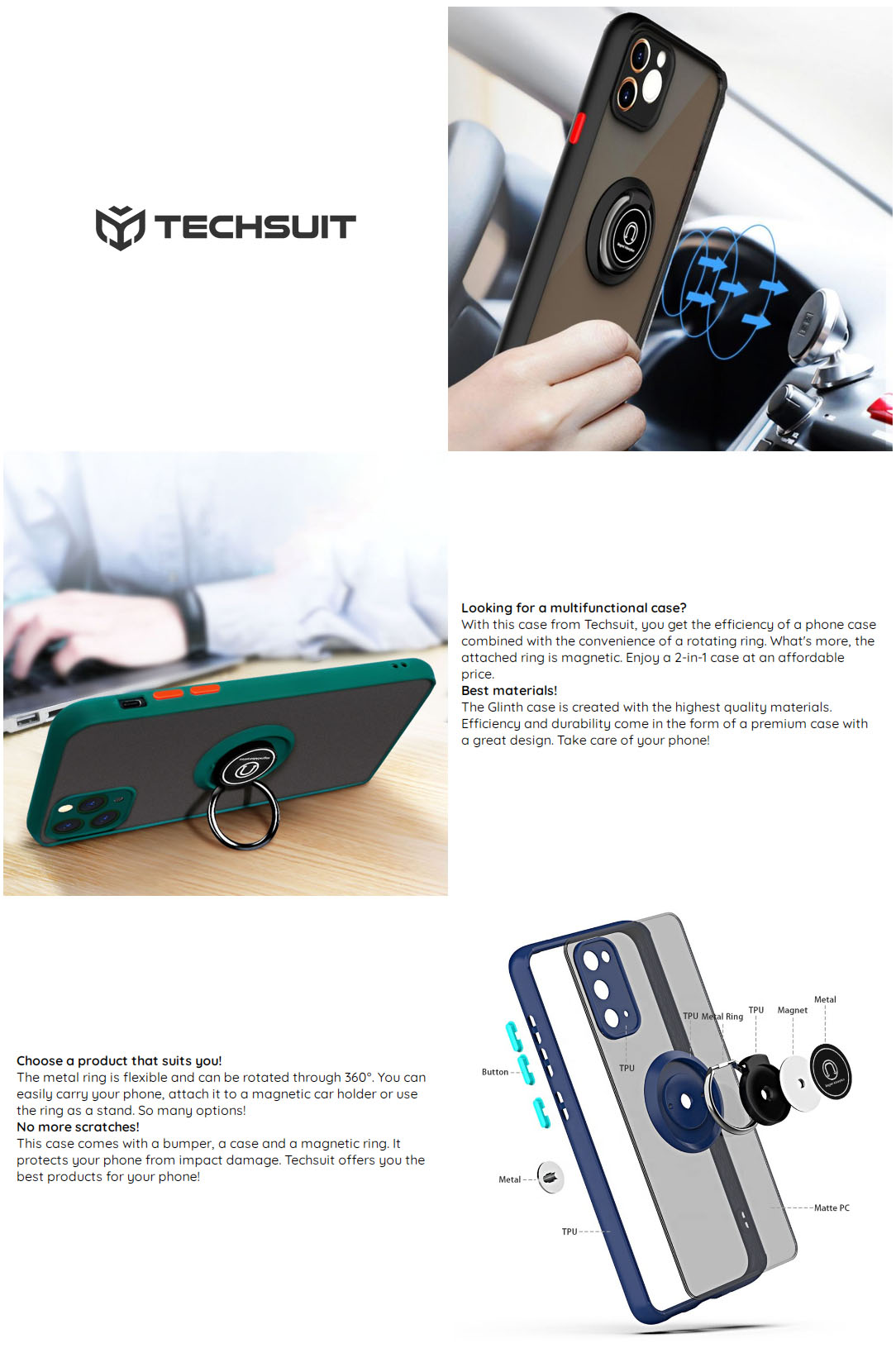 Με αυτήν την θήκη από την Techsuit, απολαμβάνετε την αποτελεσματικότητα μιας θήκης τηλεφώνου σε συνδυασμό με την άνεση ενός περιστρεφόμενου δακτυλίου. Επιπλέον, ο ενσωματωμένος δακτύλιος είναι μαγνητικός.