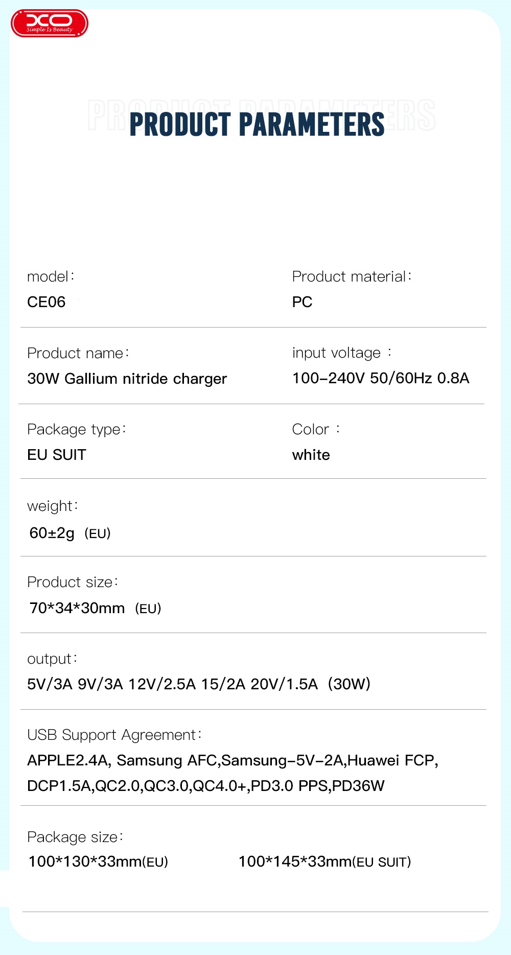 Ο XO CE06 είναι ένας προηγμένος φορτιστής τοίχου εξοπλισμένος με μία μόνο υποδοχή USB-C PD 30W. Παρέχει αρκετή ενέργεια για να φορτίσει γρήγορα ακόμη και τις μεγαλύτερες διαθέσιμες κινητές συσκευές.